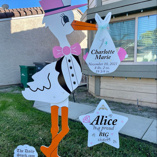 The Daily Stork ~ 619-972-3724 ~ Oceanside, California ~ Girl Stork Yard Sign ~ Sibling Sign
